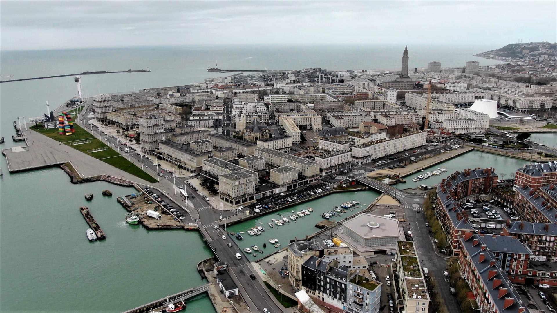 Prises de vues aériennes par drone de la ville du Havre dans le département de Seine-Maritime en Normandie, images réalisées du port de la ville pendant une prestation de tests d’interceptions et de neutralisations des drones sur la zone P28 du Havre, mission réalisée par temps pluvieux avec de fortes rafales de vent supérieur à 50 km/h avec déclaration préfectorale et toutes les autorisations de pénétration de la zone proscrite la LF-P28 du HAVRE par le Centre National des Opérations Aériennes